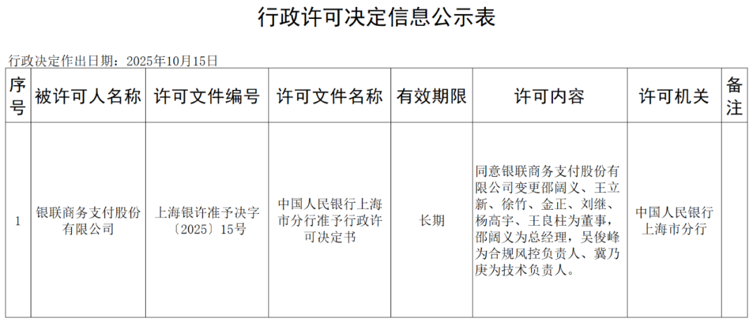 中国人民银行上海市分行更新行政许可决定信息公示表,许可文件编号“上海银许准予决字 〔2025〕15号”显示,同意银联商务支付股份有限公司变更邵阔义、王立新、徐竹、金正、刘继、杨高宇、王良柱为董事,邵阔义为总经理,吴俊峰为合规风控负责人、冀乃庚为技术负责人。