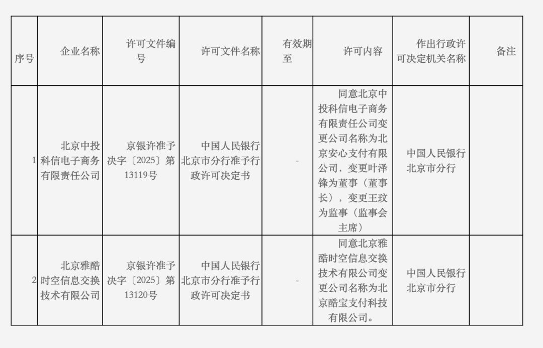 文章来源:四九八网络发布时间:2025-11-21 08:11:05热度:5近日,中国人民银行北京分行同意,北京中投科信电子商务有限责任公司变更公司名称为北京安心支付有限公司,变更叶泽锋为董事(董事长),变更王玟为监事(监事会主席);